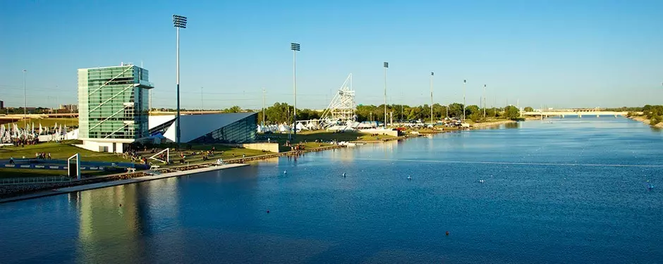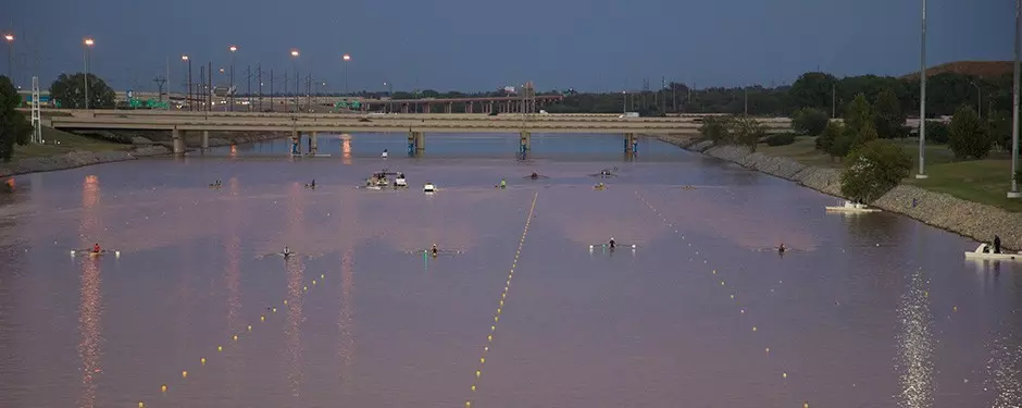 Central Rowing’s new home, The Central CHK Boathouse, is located in the Oklahoma City Boathouse District. Home to 3 modern boathouses and the 4-story tall Finish Line Tower, the Boathouse District has grown into a thriving rowing mecca drawing national and international acclaim. A recently completed canal connects the river to the heart of Downtown OKC, creating a direct link between rowing and the greater downtown community. In 2009, Oklahoma City was designated a US Olympic training site and as such includes the National High Performance Training Center, home to the US Lightweight National team operating out of the Devon Boathouse. The river includes a top of the line fully buoyed 8 lane 2,000m race course, electronic timing system, and the same system that was used at the 2012 London Olympics. With three different sections, each 5km of row-able water, the Oklahoma River provides a great practice and race venue for the UCO Rowing team.